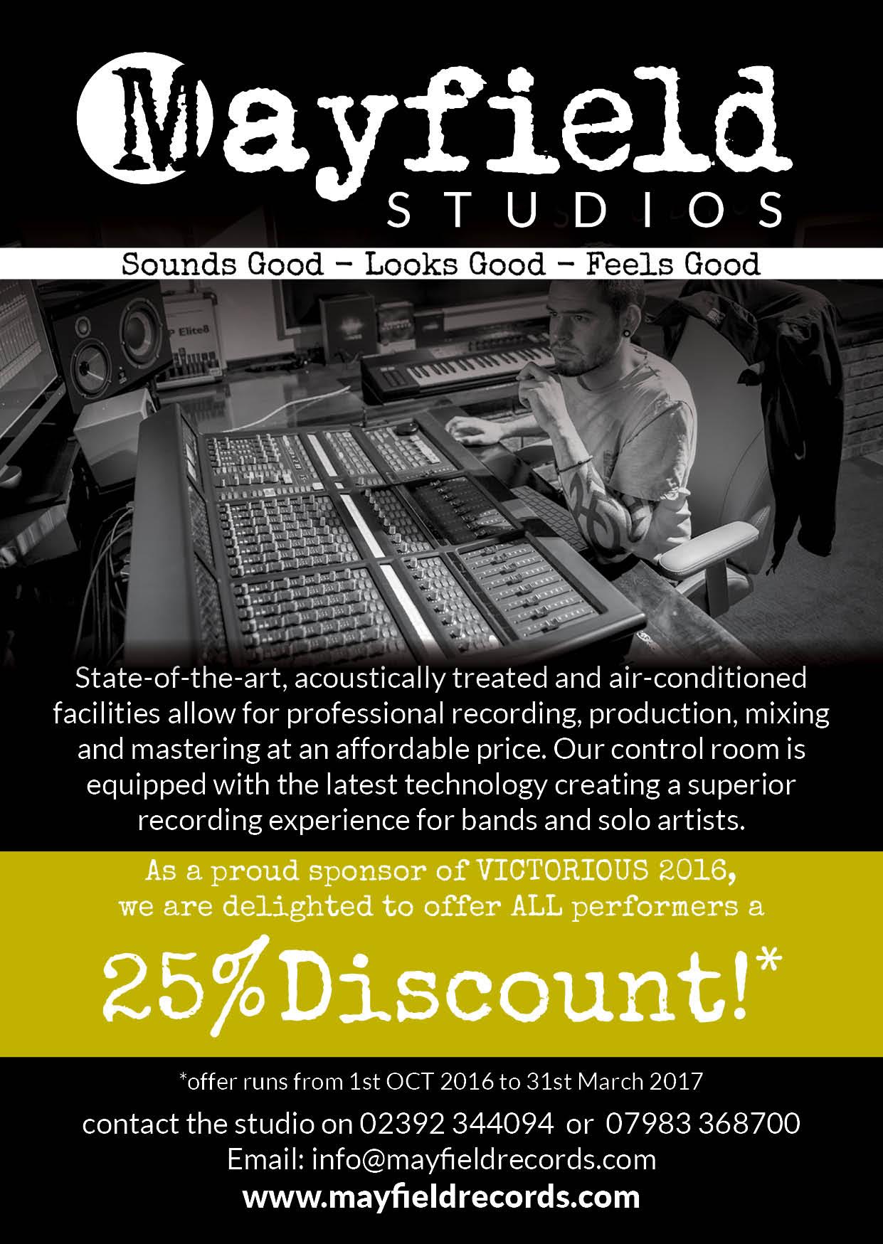 Performers Offer: The fantastic sponsors of our Real Ale Village Stage – Mayfield Studios are offering an amazing 25% off discount to all performers at Victorious Festival 2016!